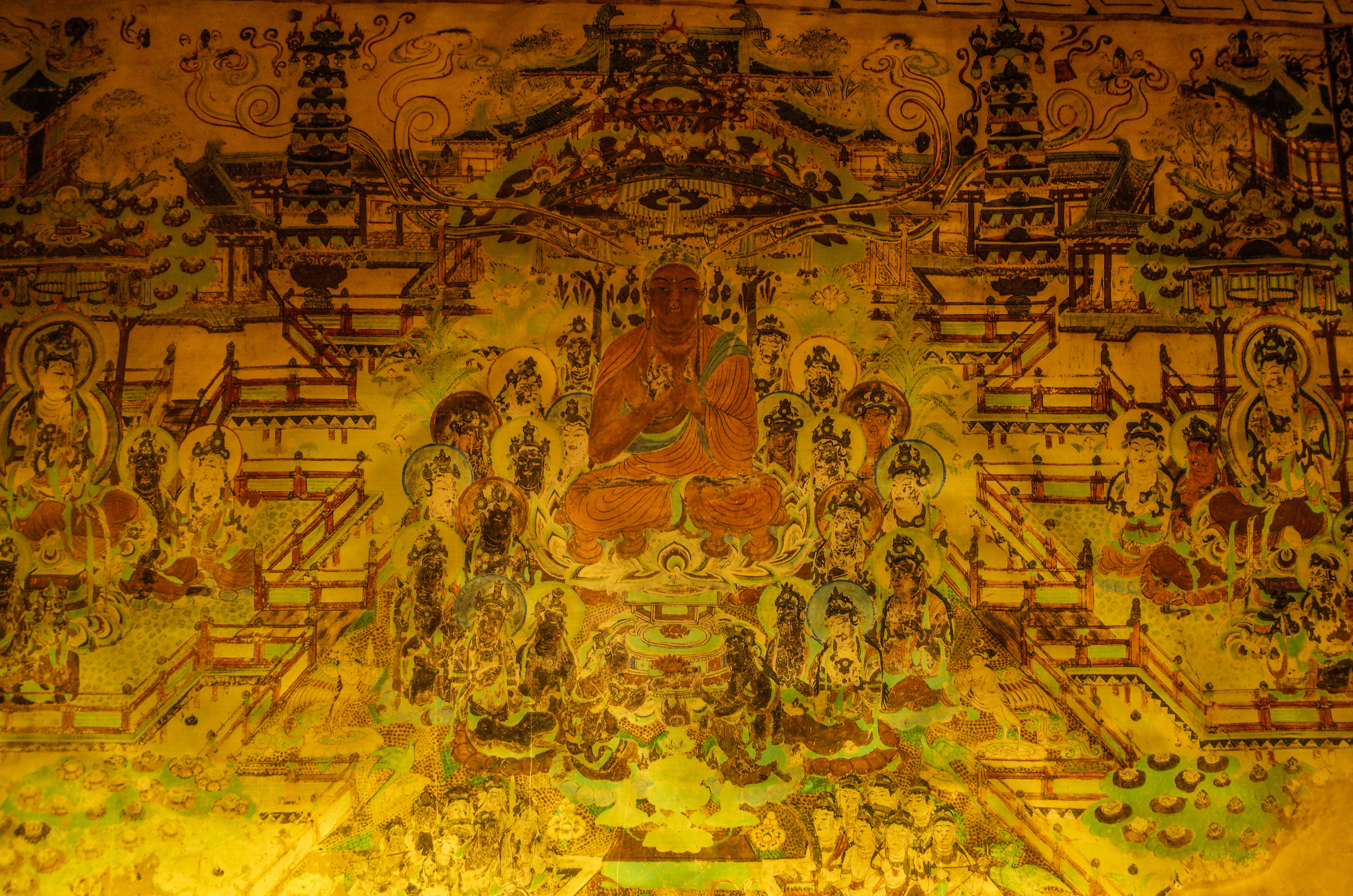 莫高窟开凿于前秦建元二年,即公元366年,历时千年方才形成如此宏大壮观的规模。敦煌壁画是敦煌艺术的主要组成部分,规模巨大,技艺精湛。敦煌壁画的内容丰富多彩,其中包括很多的古代建筑原型图像,为中国对古建筑研究留下了真实直观的资料。